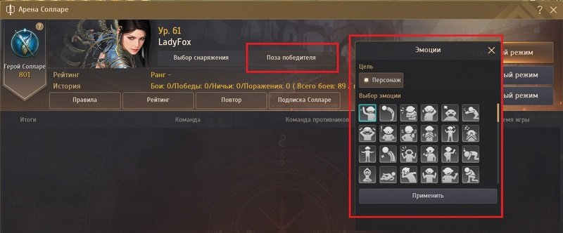 Следующие эмоции нельзя назначить в качестве позы победителя на Арене Солларе: