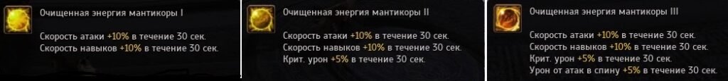 Если вы успеваете истребить монстров за 29 сек. Появится фраза «Влияние на мантикор уменьшается» и на персонаже появится бафф I с иконкой как на скриншоте выше. Пока весит первый бафф, вы должны уложиться в 29 секунд и убить следующую волну монстров, тогда ляжет бафф II и такая же механика с баффом III.