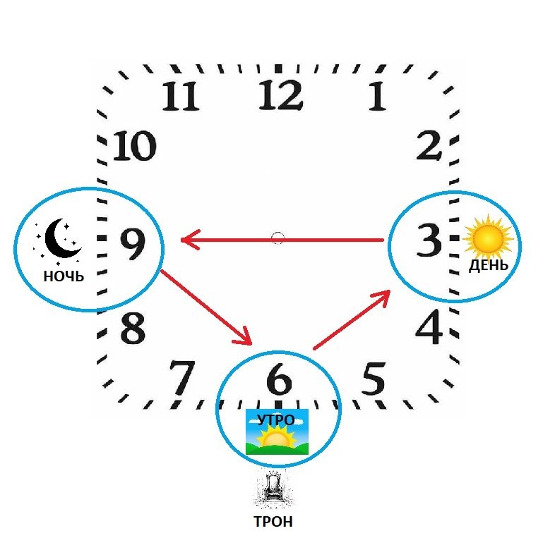 6 часов это УТРО, 3 часа это ДЕНЬ (ПОЛДЕНЬ), 9 часов это НОЧЬ.
