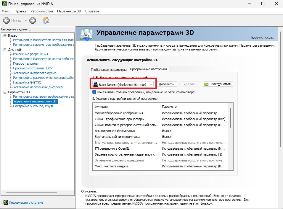 - У карт NVIDIA: настройка фильтрации текстур, анизотропной фильтрации, отключение избыточных настроек качества и др. (настройки 3D – Программные настройки – Добавляем BlackDesert и выставляем настройки под бдо)