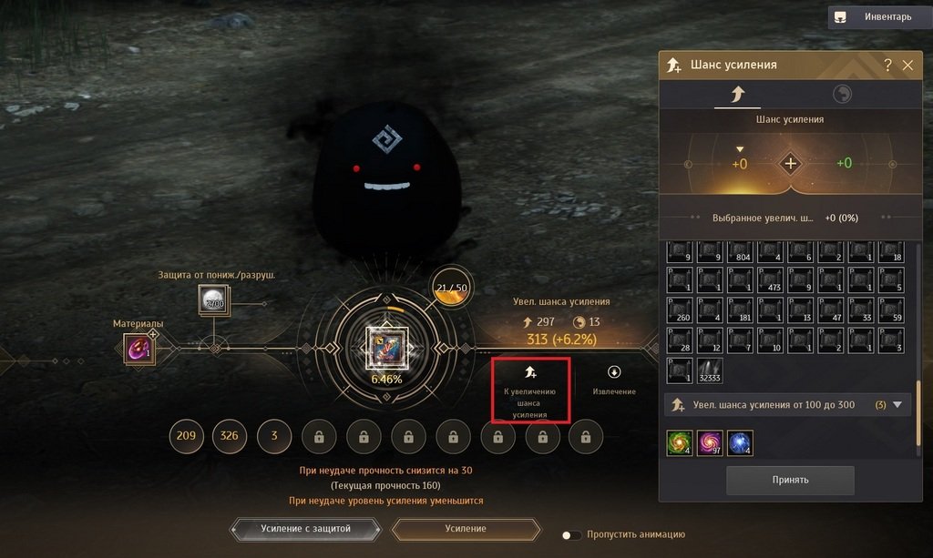 Если нажать на надпись «К увеличению шанса усиления» откроется интерфейс, где вы можете использовать: