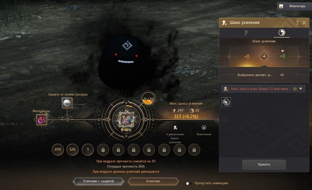 - снижается ли прочность при неудачном усилении предмета (если вы усиляете без защиты)