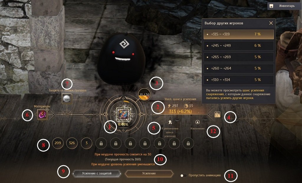 Эта иконка скрывает/открывает окно выбора других игроков. В этом окне вы можете увидеть количество фейлов используемых другими игроками для улучшения такого же предмета.