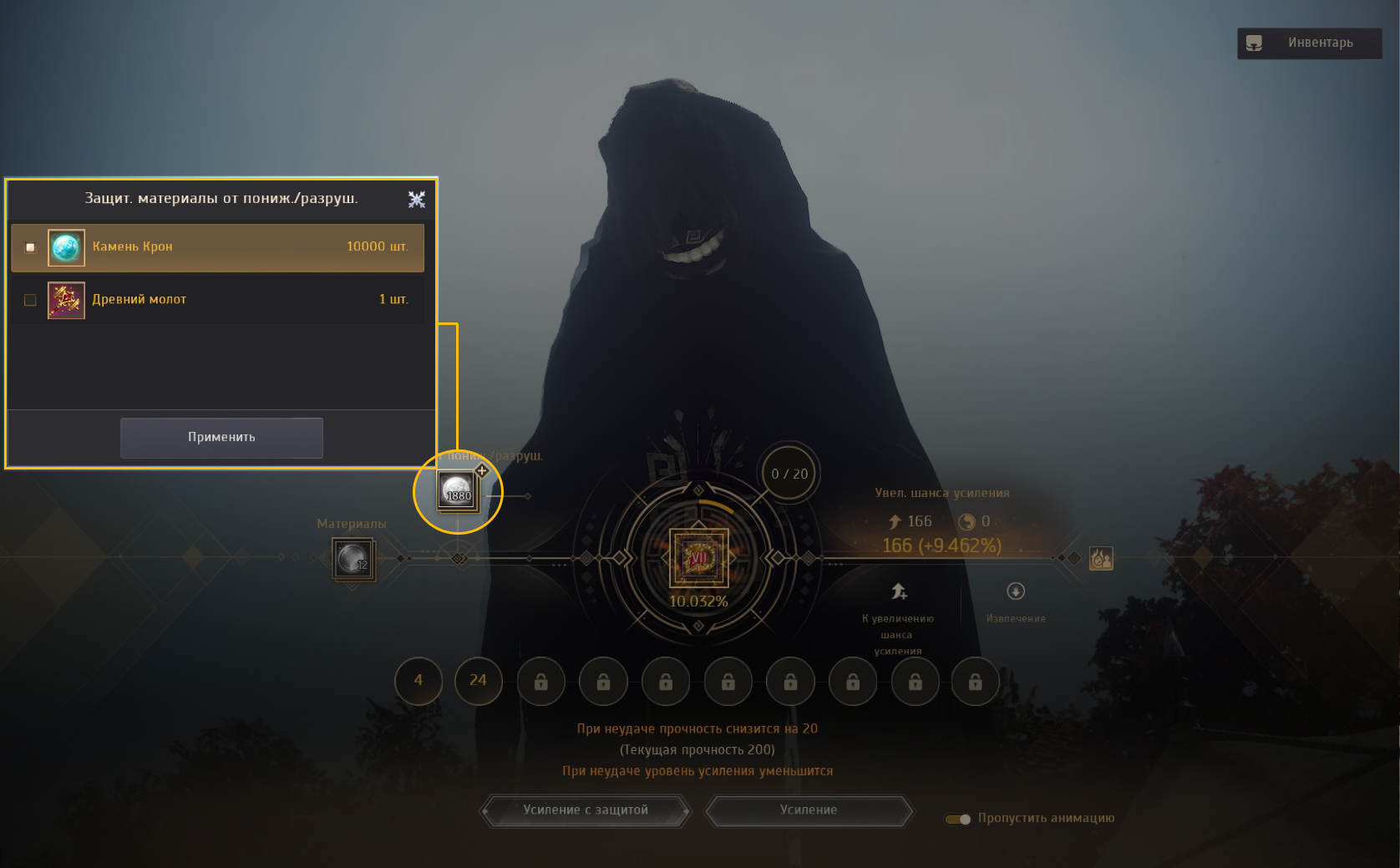 В этот слот автоматически вставляется материал, который необходим для усиления данного предмета. Если его нет в инвентаре усиления, слот будет подсвечен серым.